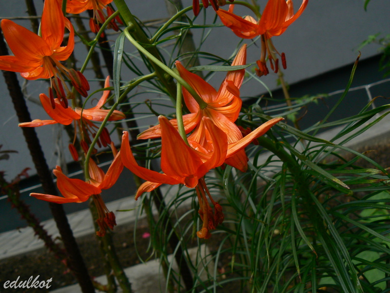 Lilium pumilum czyli Lilia drobna została opisana po raz pierwszy w 1812 roku przez Augustina Pyramusa de Candolle, botanika szwajcarskiego. Rośnie naturalnie na terenach Mongolii, Syberii, Mandżurii, Korei i w północnych Chinach. Przykra wiadomość jest taka, że to roślina krótkowieczna, czterolatka to już Matuzalem w gatunku. Dobra wiadomość - łatwo rozmnaża się z nasion. Roślina nie jest wysoka, jak zresztą sama nazwa świadczy, jeżeli osiągnie 80 cm to już dobrze, na ogół bywa niższa. Kwiat turbankowy, lśniący, jakby nawoskowany, barwy czerwono-pomarańczowej. Z moich doświadczeń wynika, że im lepsze ma warunki, tym bardziej zmierza ku żarówiastej czerwieni, tym więcej ma też kwiatów na pędzie - ponoć do dwudziestu. Pachnie, jakkolwiek uważam, że jest to zapach dla amatorów, można założyć, że spodoba się tym, którzy cenią woń wawrzynka lub hiacyntów. Jak dla mnie, dużo za dużo, aż strach pomyśleć, co by było, gdyby ta lilia była większa i miała potężniejszą siłę rażenia