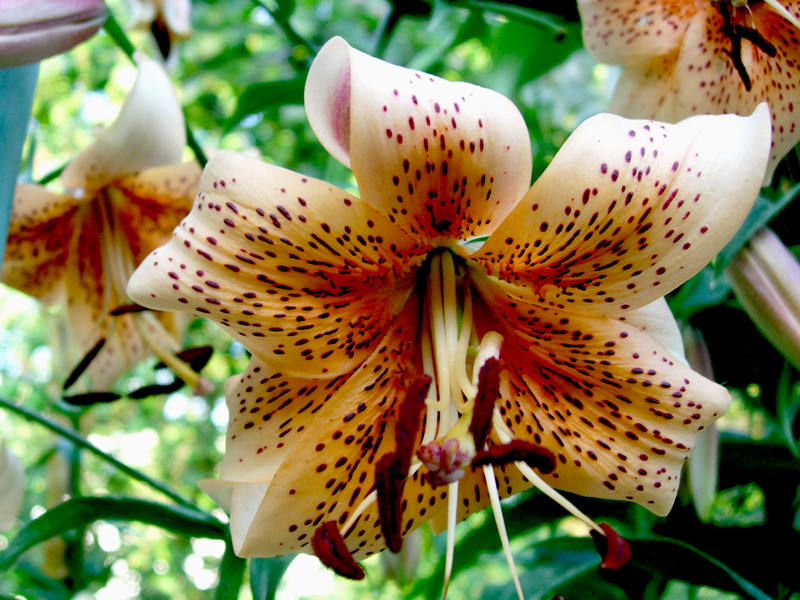 Kwiat: turbanowy, mocno wywinięty, skierowany do dołu, w kolorze pomarańczowo-łososiowym, mocno nakrapiany brązem