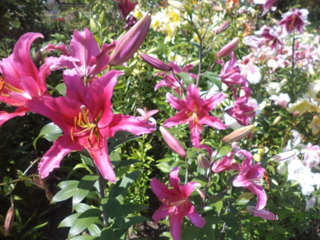 Kwiaty: duże, różowe, nakrapiane, żółto-zielona gardziel; kropki występują z różną intensywnością;