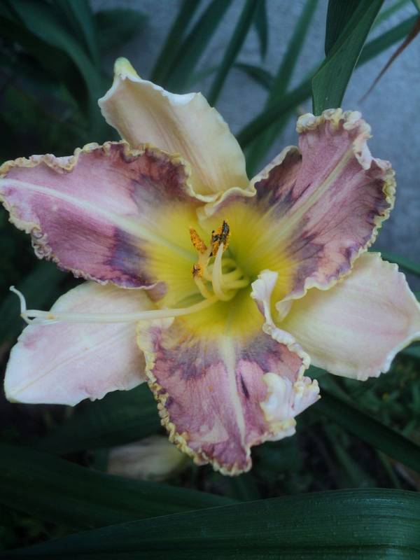 Hodowca: :Lambertson , rok rejestracji 2002 Wysokość: 60-90 cm Kwiaty: blado - różowe , fiołkowe z rozmytym szaro- niebieskim okiem , żółte gardło ,falbanka żółta , przy krawędzi płatków powtórzone kolory z oka , średnica kwiatu ok 16 cm.