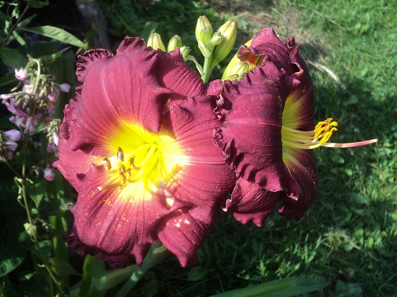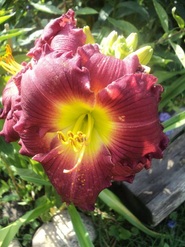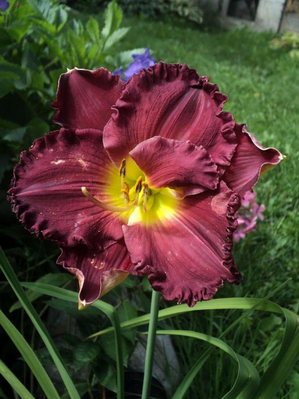 Hodowca: Shooter , rok rejestracji 2000 Wysokość: ok 60 cm Kwiaty: w kolorze burgunda z żółto- zielonym gardłem , falbanka na brzegach płatków , średnica ok 15-16 cm.