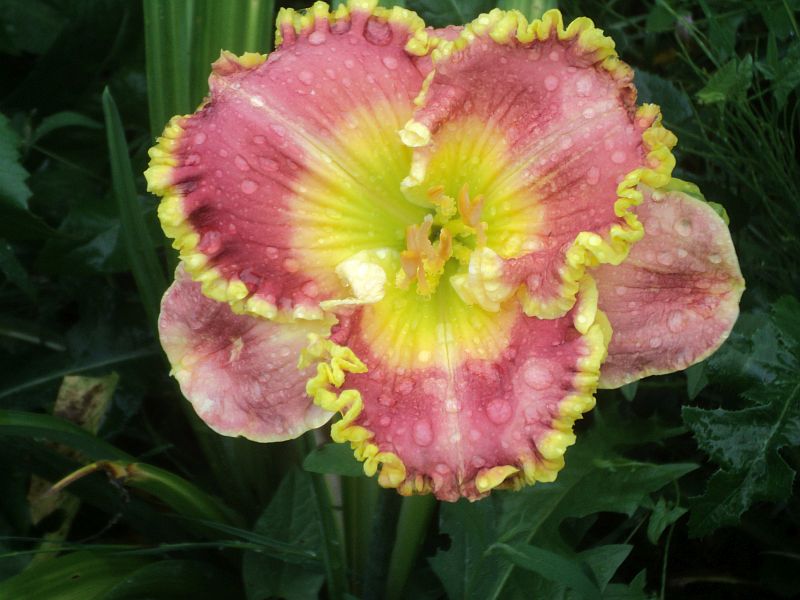 Kwiaty: różowe , z żółtym znakiem wodnym , zielonym gardłem i wyraźną żółtą falbanką , średnica kwiatu ok 16 cm.
