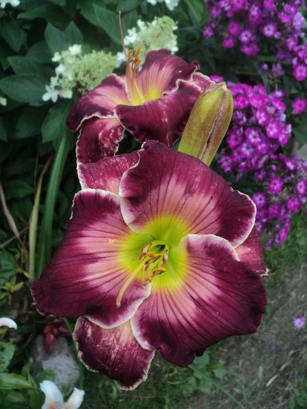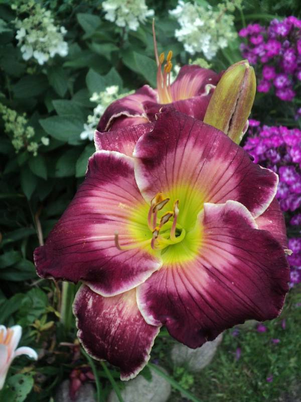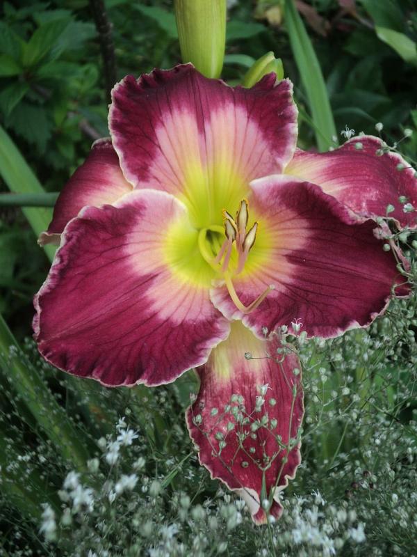 Hodowca: Rogers-C,2007 Wysokość: pęd kwiatowy na wysokości 80 -90 cm. Kwiaty:czerwono -fioletowe , z różowym znakiem wodnym nad masłowo- zielonym gardłem, brzegi płatków zaznaczone na biało leciutko sfalowane , średnica ok 15 cm , kwiat otwiera się szeroko. Zakwita w lipcu. Stanowisko: słoneczne do półcienistego. Mrozoodporność: zimuje bez okrycia.