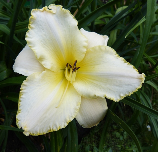 hodowca: Salter, 1995 wysokość: 60cm kwiat: o średnicy 15 cm w "prawie" białym kolorze z zieloną gardzielą i zielonkawą falbanką. termin kwitnienia: lipiec