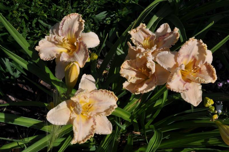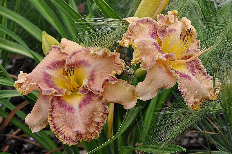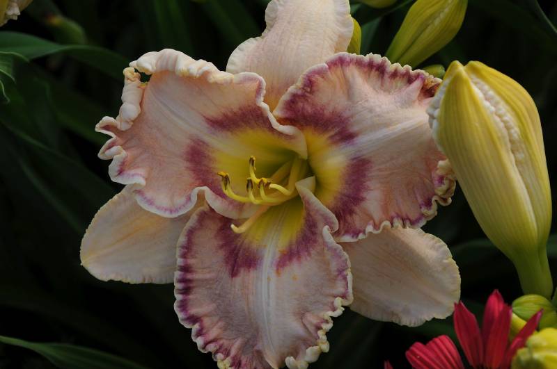 hodowca: Lambertson, 2003 wysokość: 50-60 cm kwiat: masywny kremowo-różowy z ciemniejszym okiem i żółtawym gardłem. Płatki z falbanką w ciemniejszym kolorze. termin kwitnienia: czerwiec-lipiec