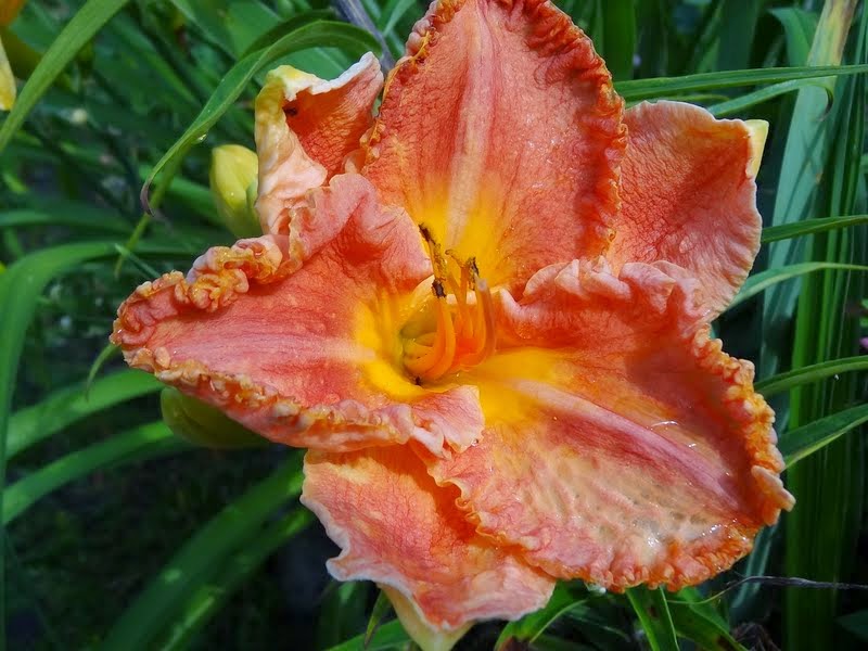 Hodowca: Kinnebrew-J. ,1999 Wysokość: ok 60 cm Kwiaty: koralowe ze złotą falbanką , gardło żółte, średnica kwiatu ok 16 cm Zakwita w lipcu . Stanowisko: słoneczne do półcienistego. Mrozoodporność: zimuje bez okrycia.