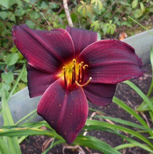 kwiat 14 cm, aksamitny czarno-czerwony z zieloną gardzielą, może powtarzać kwitnienie.