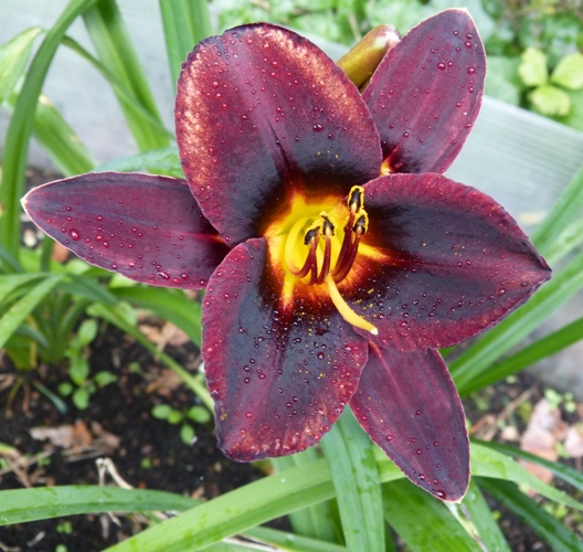 kwiat 15 cm, może powtarzać kwitnienie, Brązowo purpurowy z bordowym brzegiem płatków