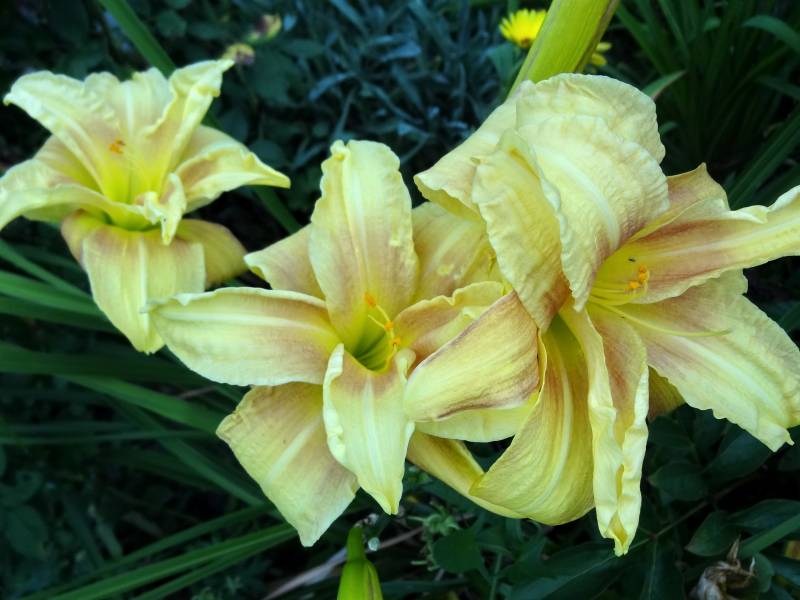 bloom 13 cm, podwójny, jasno żółty z czerwonymi cieniami na jasnożółtym oku i gardzieli.