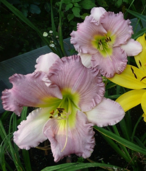 kwiat 15 cm, lawendowo różowe petale, jaśniejsze sepale, falbanka, oko prawie niewidoczne, zielono-żółta gardziel. Wybarwienie kwiatów bardzo zależne od pory dnia, nasłonecznienia. Słabo przyrasta ale pięknie kwitnie