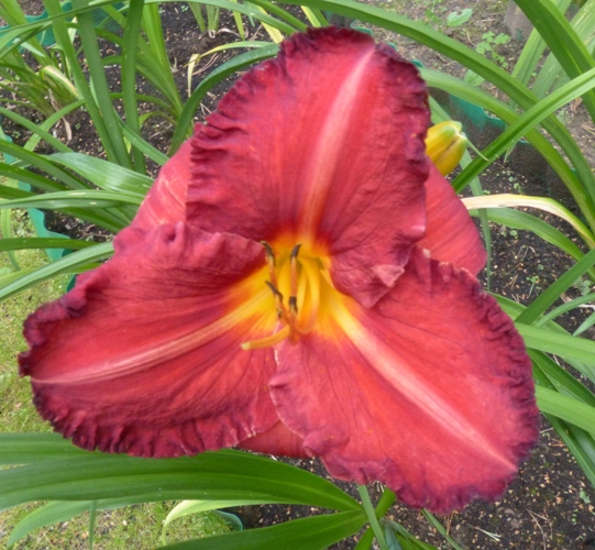 kwiat 14 cm, jasny koralowy z malinową strefą oka i złoto żółtą gardzielą