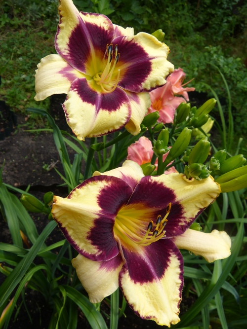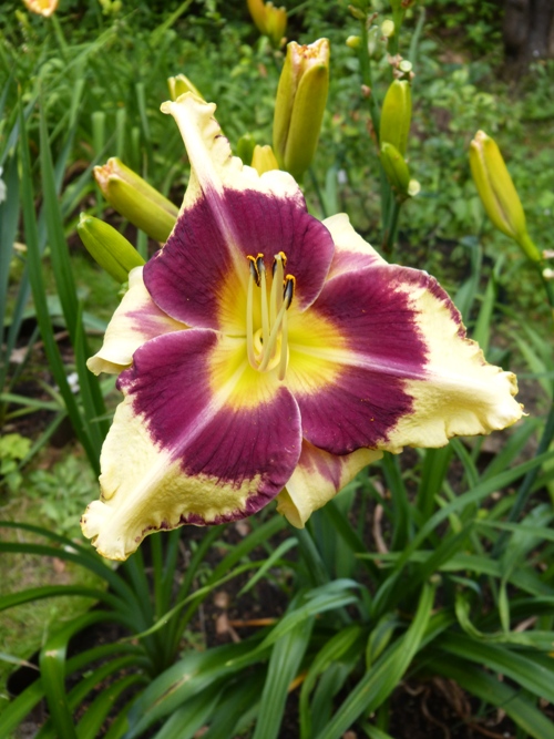 kwiat 14 cm, żółty z ciemno fioletową aureolą dookoła zielonej gardzieli, może powtarzać kwitnienie