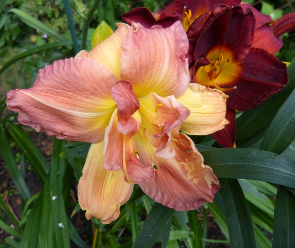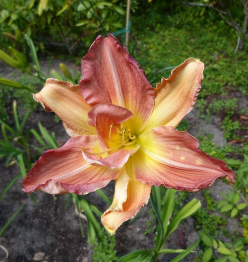 kwiat 15 cm, pełny w 80%, podobno pachnie i powtarza kwitnienie, czerwono-pomarańczowo różowy z zielono-żółtą gardzielą.