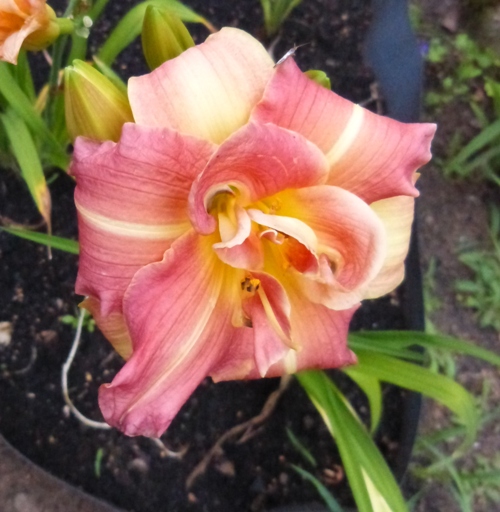 kwiat 12 cm, pełny, może powtórzyć kwitnienie, różowy z zielono-żółtą gardzielą