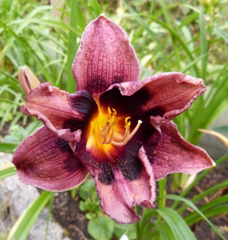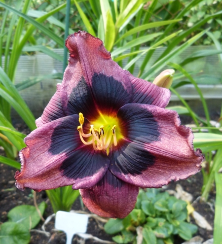 kwiat 11 cm, ciemno purpurowy z prawie czarnym okiem z żółto zieloną gardzielą, może powtarzać kwitnienie.