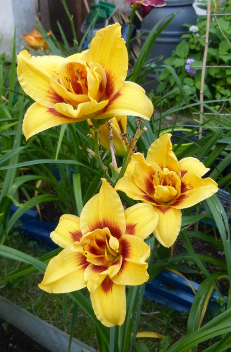 kwiat 14 cm, kremowo fioletowy z fioletowym okiem, pełny. Fioletu to ja w nim nie widzę a prędzej bordowo brązowy....