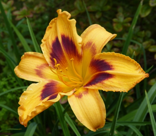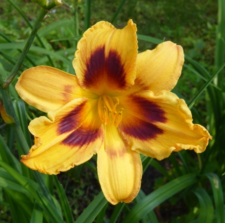 kwiat 14 cm, pomarańczowo żółty z szerokim czerwonym okiem i zielonkawo żółtą gardzielą, może powtarzać kwitnienie