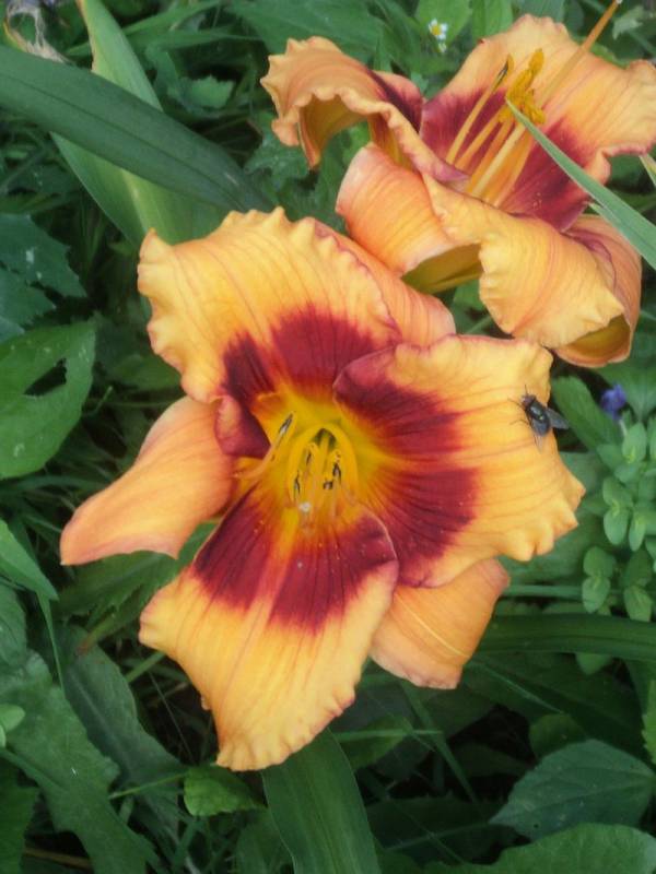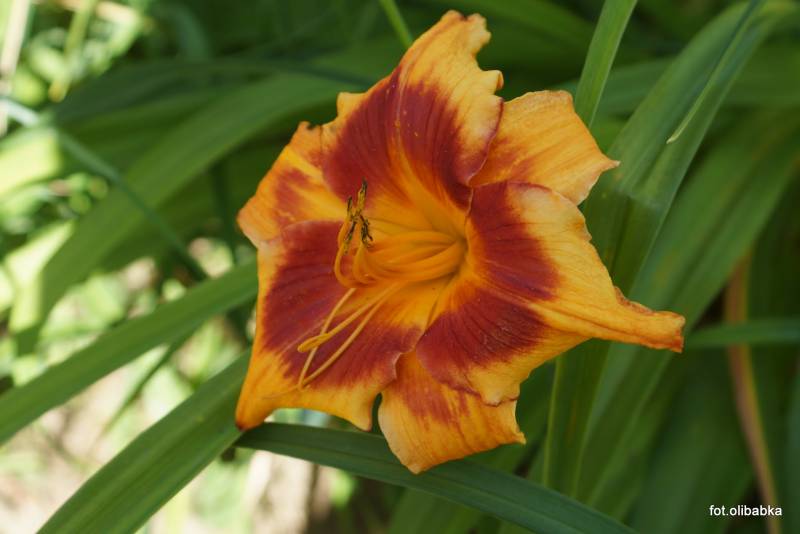 Kwiaty: pomarańczowo-czerwone z pomarańczowym gardłem i szkarłatnym okiem , lamówka na płatkach w kolorze oka, średnica kwiatu ok 15 cm Zakwita w lipcu .