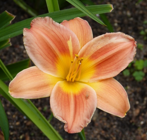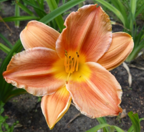 kwiat 15 cm, kolor trudny do przetłumaczenia: cieniowana przypalona sienna (w oryginale "burnt sienna bitone") z żółtymi żebrami i żółtozieloną gardzielą