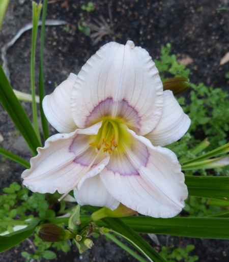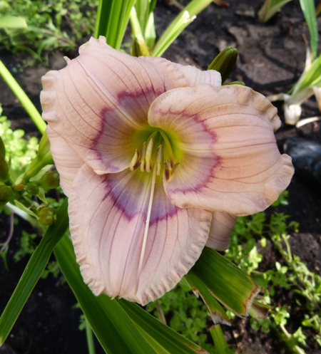 kwiat 9 cm, kolor orchidei z ciemno różowym (wpadającym w bordo?) narysowanym ołówkiem okiem i zieloną gardzielą (w oryginale "Orchid with cerise pencil eyezone and green throat".