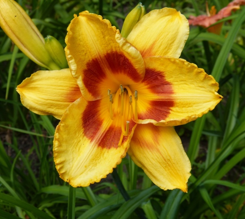 kwiat 14 cm, złoto żółty z czerwoną wąziutką lamówką na płatkach i głęboko czerwonym okiem i zieloną gardzielą.