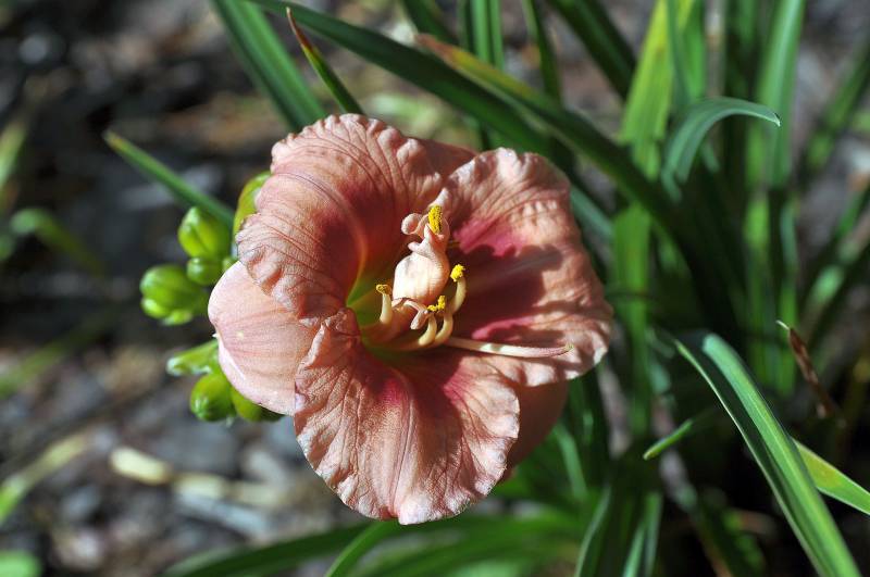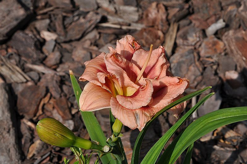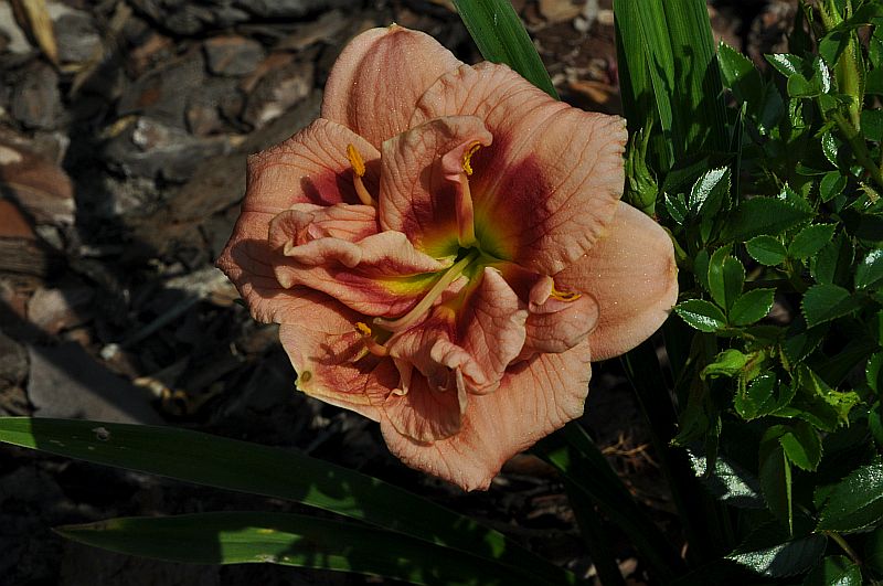 Hodowca: Stamile-G., 2000 Wysokość: 30 cm Kwiat: 6-7 cm, brzoskwiniowo-różowy z ciemniejszym okiem i zielonym gardłem, najczęściej pełny, choć mój był pełny tylko w pierwszym sezonie, potem dwa lata wyłącznie pojedynczy Termin kwitnienia: czerwiec, lipiec