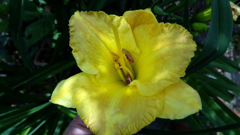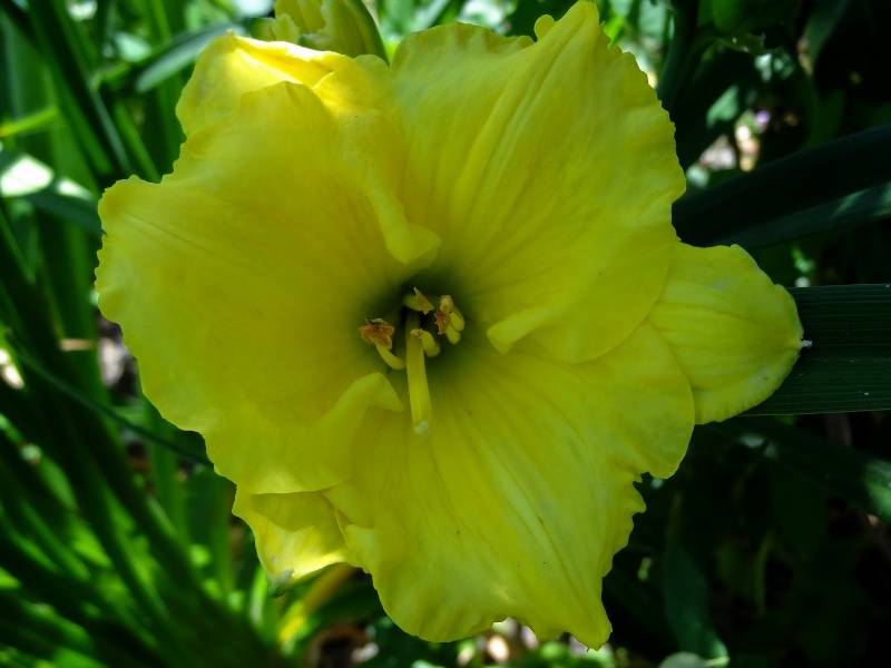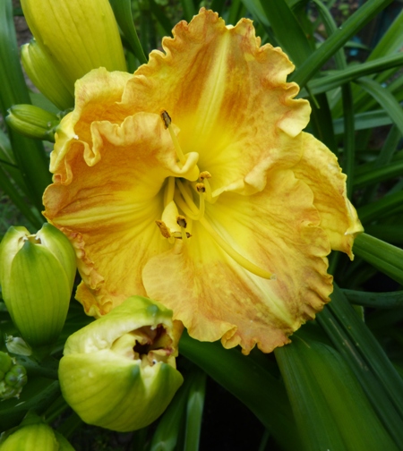 kwiat 15 cm, złoty "przeczesany" zmieszany (?) brązem z ogromną lemonkowo żółtą gardzielą, podobno pachnie