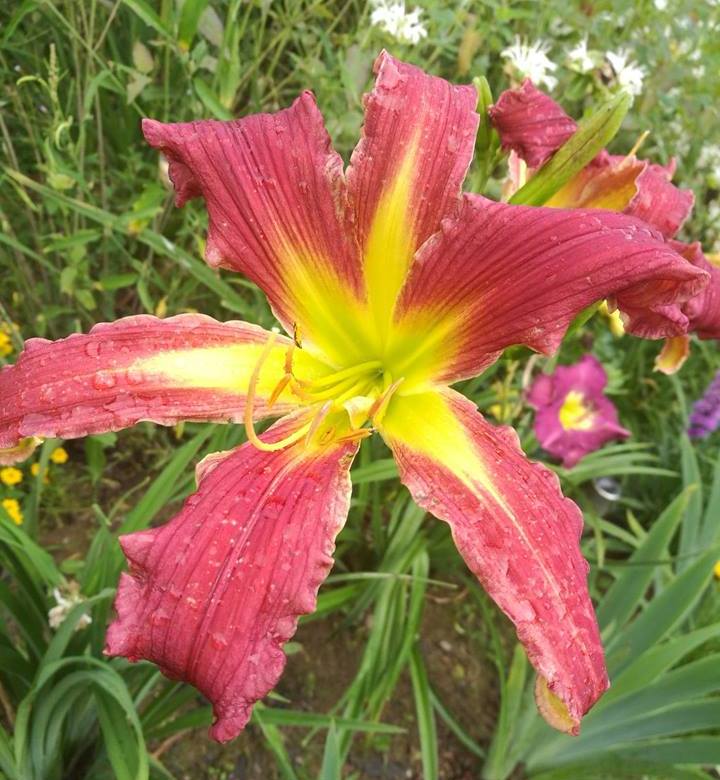 Liliowiec (Hemerocallis) Raspberry Star Hodowca: Hansen 1994 Wysokość: do 120 cm Kwiaty: malinowo-czerwone z dużym żółtym gardłem Stanowisko: słoneczne