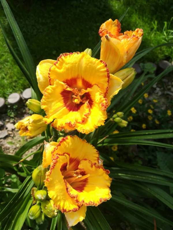 Liliowiec (Hemerocallis) 'Merry Moppet' Hodowca: Salter-E.H (2002) Wysokość: ok 69 cm Kolor: jasno żółty z czerwonym okiem i krawędzią (średnica kwiatu ok 9 cm) Stanowisko: słoneczne umiarkowanie wilgotne Kwinienie (pierwsze kwiaty pojawiły się w lipcu) Zimowanie: (u mnie zimuje bez problemu) Uwagi : Liliowiec dobrze się rozrasta tworzy dużo pędów kwiatowych powtarza kwitnienie