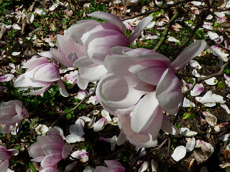 Rośnie w słońcu, od strony południowej, ale dość blisko domu, może dlatego jej cieplej zimą. Właściwie przytula się do niego. Musiałem zacząć po trochu odcinać dolne gałęzie, bo nie można było przejść, no i stała się z czasem pewnym problemem dla azalii, rzuca zbyt dużo cienia. Także dlatego trzeba ją podcinać, ale znosi to dobrze. Była kaprysem Mamy. Pojechała kiedyś z nami do ogrodnika i tak sobie oglądała etykiety, na których były kwiaty, no i wybrała. Nie przyszło nam jakoś do głowy sprawdzić, co z tego może wyrosnąć. Dopiero, kiedy już rosła w najlepsze, zainteresowałem się nią bliżej, okazało się, że np. w Ameryce to regularne drzewo, podcinane od dołu wytwarza piękną koronę. Dlatego trochę nas przeraża, ale w okresie kwitnienia często zachwyca. Szkoda tylko, że magnolie kwitną tak wcześnie, akurat wtedy, kiedy w naszym klimacie mamy nocne przymrozki, więc nie zawsze pokazuje, na co ją stać.