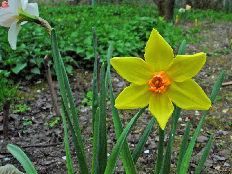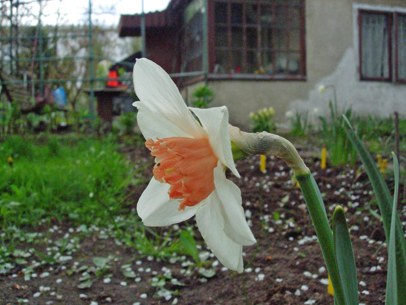 Narcissus poeticus. Zazwyczaj to o nim myślimy kiedy używamy nazwy narcyz, jednak narcyzy to nie tylko obłędnie pachnące białe kwiaty z małym przykoronkiem - żółte żonkile z trąbiastym "czymś"na miejscu przykoronka to też narcyzy. W Polsce można uprawiać w gruncie całkiem sporo gatunków: wspomnianego