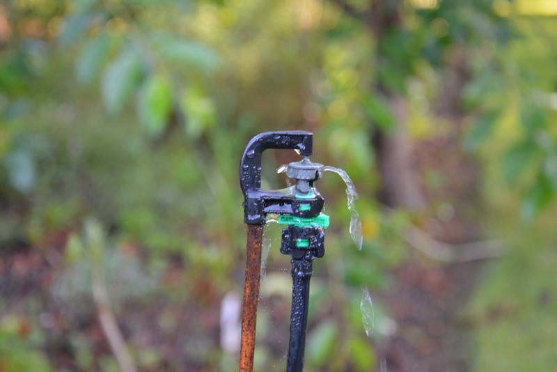 Na mniejszych obszarach (przy płocie, przy tarasie) daję mniejszy wirnik (E) lub wkładkę 180 stopni (D). Na stronie dystrybutora można znaleźć opisy każdej z tych wkładek (wirników) wraz z kształtem rozprysku wody, jaki umożliwiają. Zasięg można także w jakimś stopniu regulować wysokością umieszczenia spryskiwacza, ale to mocno zależy od tego, czy w danym miejscu jest wietrznie, czy możemy podlewać rośliny z góry itp. Można dokupić gotowe podstawy do montowania takiego zraszacza, ale ja korzystam ze zwykłego pręta zbrojeniowego fi 5mm, który wbijam w ziemię na wymaganą wysokość. Można go kupić w każdym składzie budowlanym