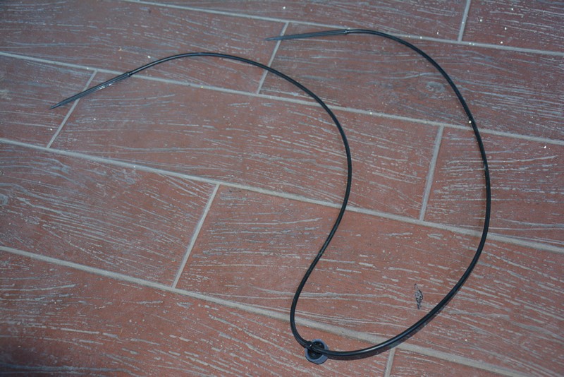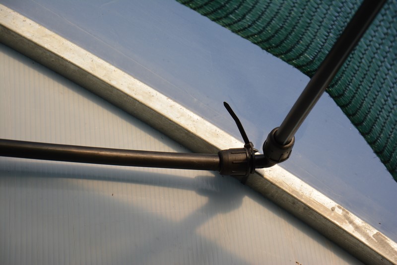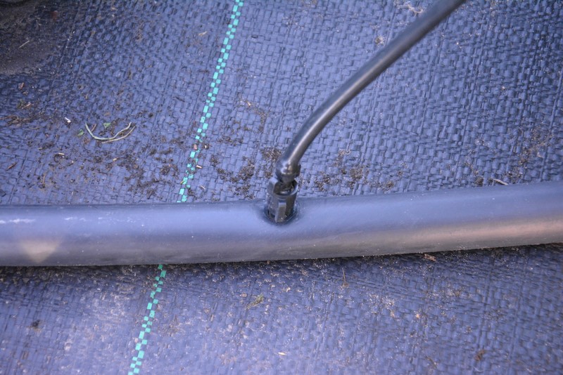 Na drugiej fotce pokazałem na dole dwa elementy służące do łączenia spryskiwacza z rurą zasilającą. Sam spryskiwacz łączy się z tymi elementami wężykiem 7/4 mm (typowy w systemach nawadniających, do kupienia w każdym sklepie z nawodnieniami, koszt ok 1 zł za metr), który naciąga się na końcówki. Warto przed naciąganiem zanurzyć końcówki wężyka we wrzątku (staje się bardziej elastyczny). Wężyk kupujemy z metra i przycinamy na wymaganą długość (w zależności od wysokości, na jakiej chcemy go zamontować, czyli w przybliżeniu nieco krócej, niż długość pręta, na którym go montujemy). Do jego przycinania możemy użyć zwykłych nożyczek. Montowanie do węża zasilającego wygląda tak: