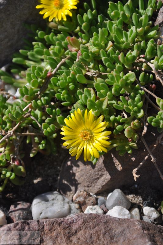 Słonecznica górska - Delosperma lineare. Niestety nie przetrwała zimy, w sezonie okazała się zbyt ekspansywna na to stanowisko, ale pięknie kwitnie i wdzięczna to roślina skalna.