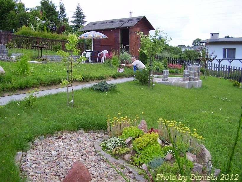 Wycięliśmy z trawnika darń na planie koła o średnicy 2 m. Na obwodzie koła zostały wyłożone podłużne kamienie - z jednej strony wyższe, na połowie obwodu mniejsze. Chodziło o oddzielenie skalniaka od trawnika.