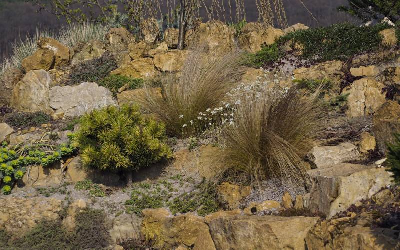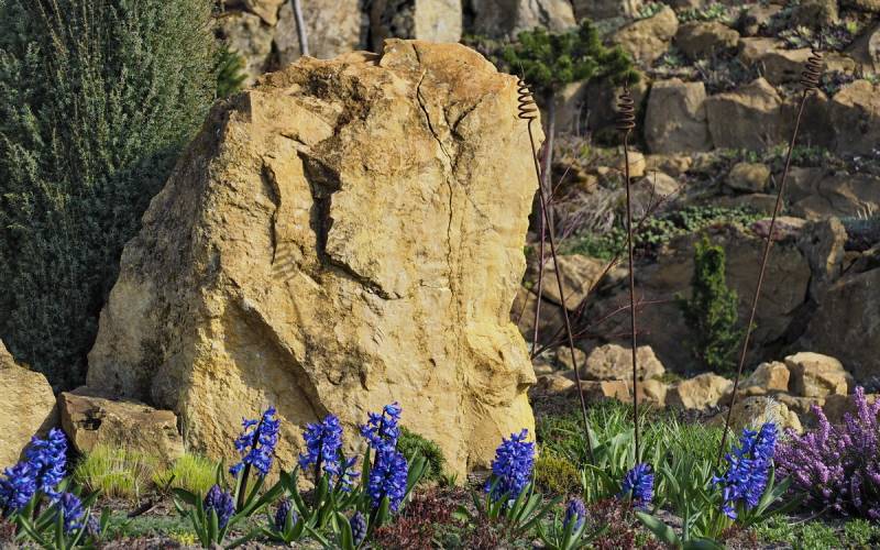 Beato kolorowe głazy fajnie kontrastują z roślinami i nie zlewają się z podłożem. Przez to ogród skalny zyskuje na wyrazistości.