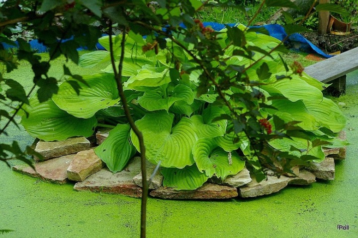 Było to okragłe oczko z wyspą, na której rosnie hosta Sum and Substance. Aby dać jej neutralne tło, nie nasadzałam tam kolorowych, odciągających wzrok roślin, tylko zwykłą rzęsę wodną.