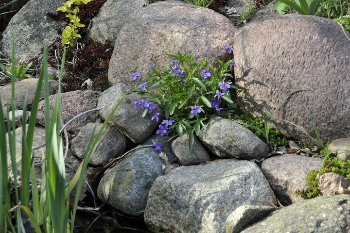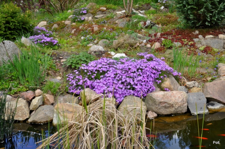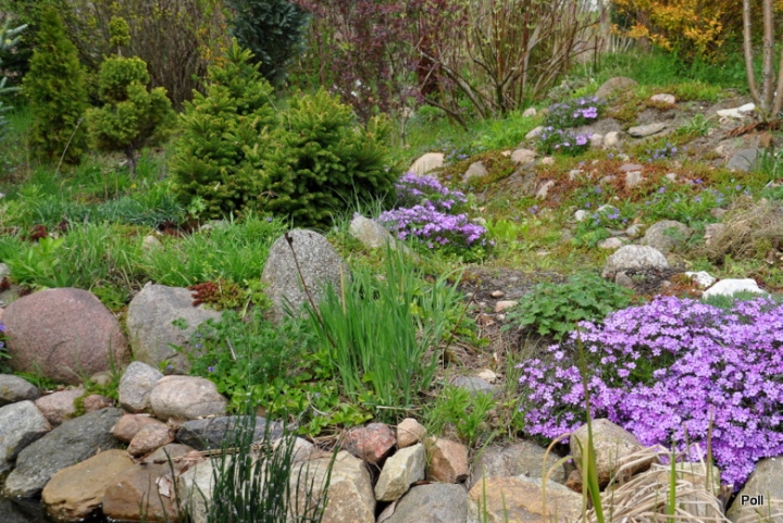 Następnym było oczko przy skalnej górce, w którą wtopione są okrąglaki zbierane w okolicy. Nie mam tam wypaśnych roślin skalnych, ale sporo iglaków i zwykłych wiosennych skalniaków np floksy szydlaste, czy ubiorki. Do obudowania oczka użyłam więc takich samych okrąglaków.