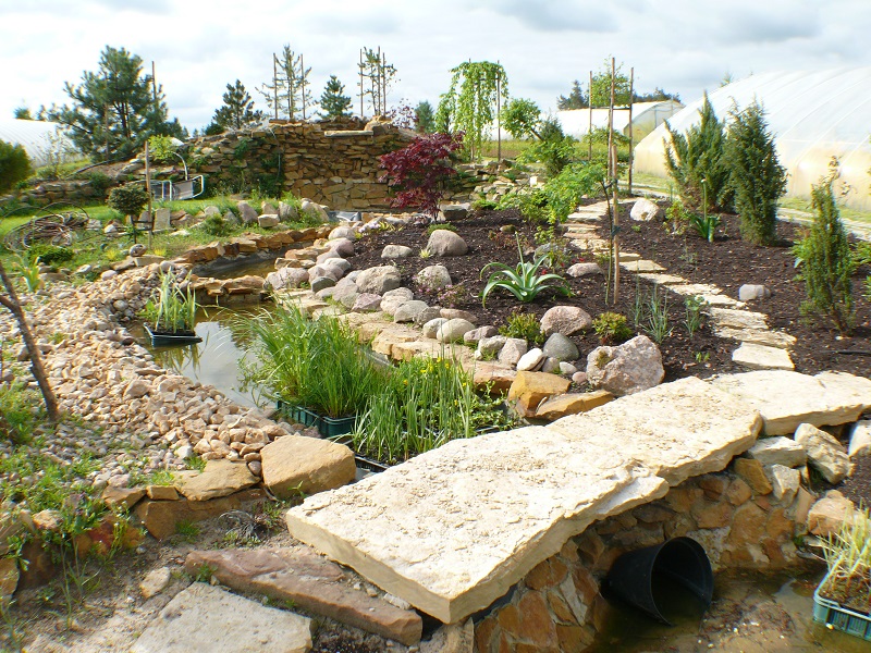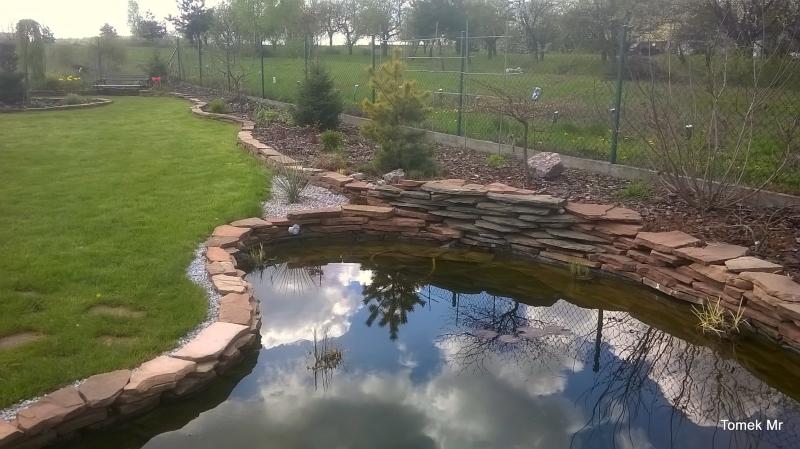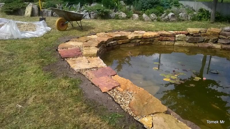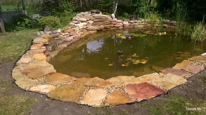 Tu brzegi oczka zostały wyłożone płaskimi blokami piaskowca.
