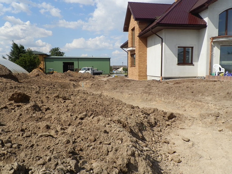 Gotowy wykop należy oczyścić z kamieni, korzeni i innych ostrych przedmiotów a następnie można lekko podsypać przesianym piaskiem lub wyłożyć włókniną lub flizeliną jak na zdjęciu poniżej.
