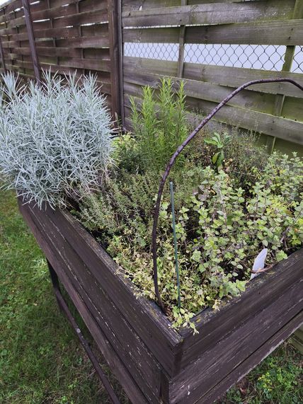 I ziółkom wielotetnim też jest dobrze. Mam majeranek (drugi rzut, pierwszy już ususzony), tymianek, "maggi" czyli kocankę włoską, i cebulę na szczypior.