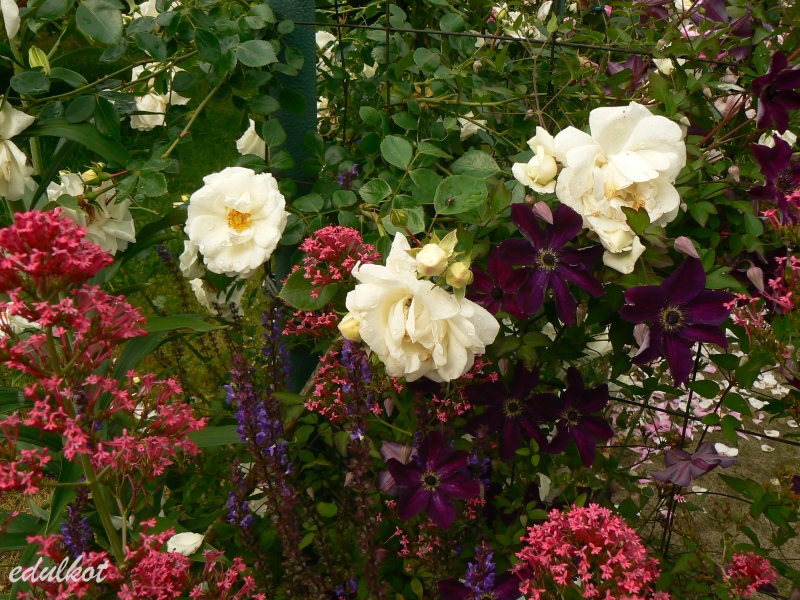 powojnik Night Violet, róża White New Dawn i czerwony ostrogowiec