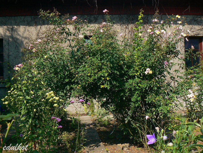 Różę Souvenir de Louis Lens wczoraj obcinałam i w trakcie tej pracy wpadłam na pomysł żeby ją zostawić tam gdzie rośnie tylko dać jej dwa łuki nad bocznymi chodniczkami.