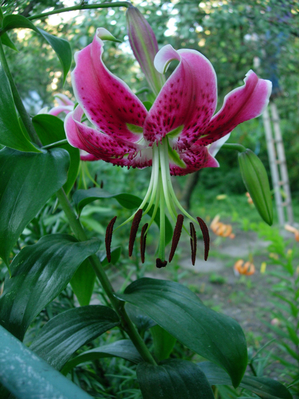 Lilia, rosła tak sobie i jak wydała w końcu jeden kwiatek (wtedy okazało się, że to martagon i powinien mieć zasadową ziemię) to powoli zaczęła widnąć i w lipcu (02.07.2016) wyglądała tak