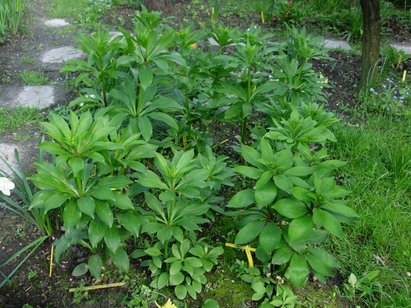 Do lilii mieszańców złotogłów trzeba mieć cierpliwość. Dlatego nie za bardzo nadają się do masowej produkcji kwiatów. Poza tym ich kwiaty trudno transportować, ze względu na ich ułożenie na łodydze. W tym roku pięknie mi wyszły z ziemi (nawet ta, której w tamtym roku nie było widać).