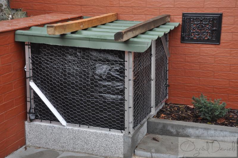 Budowlę wykonał Tadeusz, konstrukcja z kątowników (podstawa 0,8 m x 1,0 m, wysokość o,8 m), na bokach siatka "dla kur", w środku dodatkowo agrowłóknina. Konstrukcja jest ze wszystkich 4 stron.