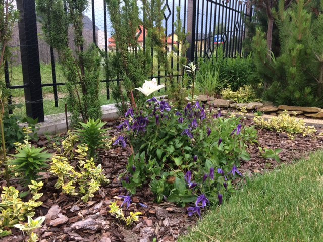 zamglona zachodzącym słońcem fotka..i dobrze, bo słabiej widac chore jaowce. Za to lilie jak zawsze niezawodne- jedna z najstarszych kęp