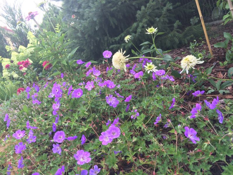 dodatkowa plama koloru w tym miejscu, to przecudowne bodziszki ROzanne- kwitną cudownie i nieprzerwanie. Dla podkreślenia ich koloru dostały do towarzystwa jeżówki Mozzarella- kupione 2 tyg temu, więc jeszcze mocno nieopierzone..