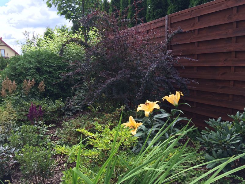 Powinnam powoli pomyśleć o jakimś odmłodzeniu pęcherznicy Diabolo, ale też nie chcę robić tego radykalnie. Ona wypuszcza sporo młodych odrostów, a ja lubię ją w tej diabolicznej, ogromnej wersji. Jest duża, ale jednocześnie filigranowa. Luteus był wielkim dominującym krzaczorem, a Diabolo jest taka zwiewna.