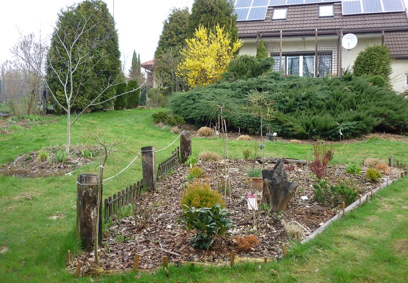 Na rabacie środkowej mało się dzieje. Modrzew dopiero otwiera maleńkie pączki, róże i hortensje bukietowe przeżyły zimę bez uszczerbku, ale zdecydowanie jest to rabata letnio-jesienna... muszę jesienią zadbać o kwiaty wiosenne w tym miejscu